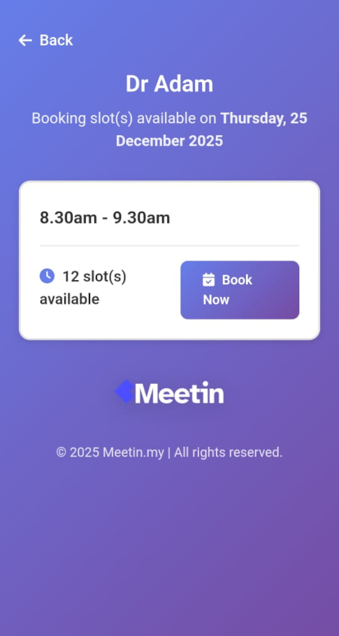 Clients book available time slots instantly and effortlessly.